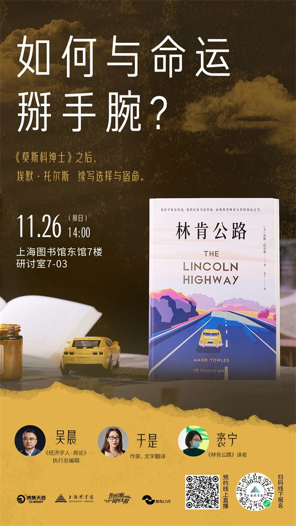 埃默·托尔斯是当代美国出版界的宠儿,从首作《上流法则》开始,从未有过失败的作品。《林肯公路》讲的是四个少年的公路漂流,最终展露的则是人的选择与宿命,是生命中可以改变的与无可奈何的一切。11月26日下午,我们邀请了《经济学人·商论》执行总编吴晨老师,作家、翻译家于是老师,《林肯公路》的译者袤宁老师,一起沉浸式品味《林肯公路》文本的多重意蕴,及其美学价值。