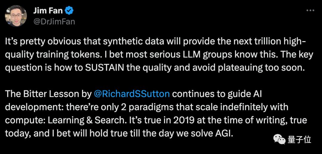 虽然更多的都还是猜测,但合成数据和强化学习是否能把AI带到下一个阶段,已经成了业内讨论最多的话题之一。英伟达科学家范麟熙认为,合成数据将提供上万亿高质量的训练token,关键问题是如何保持质量并避免过早陷入瓶颈。