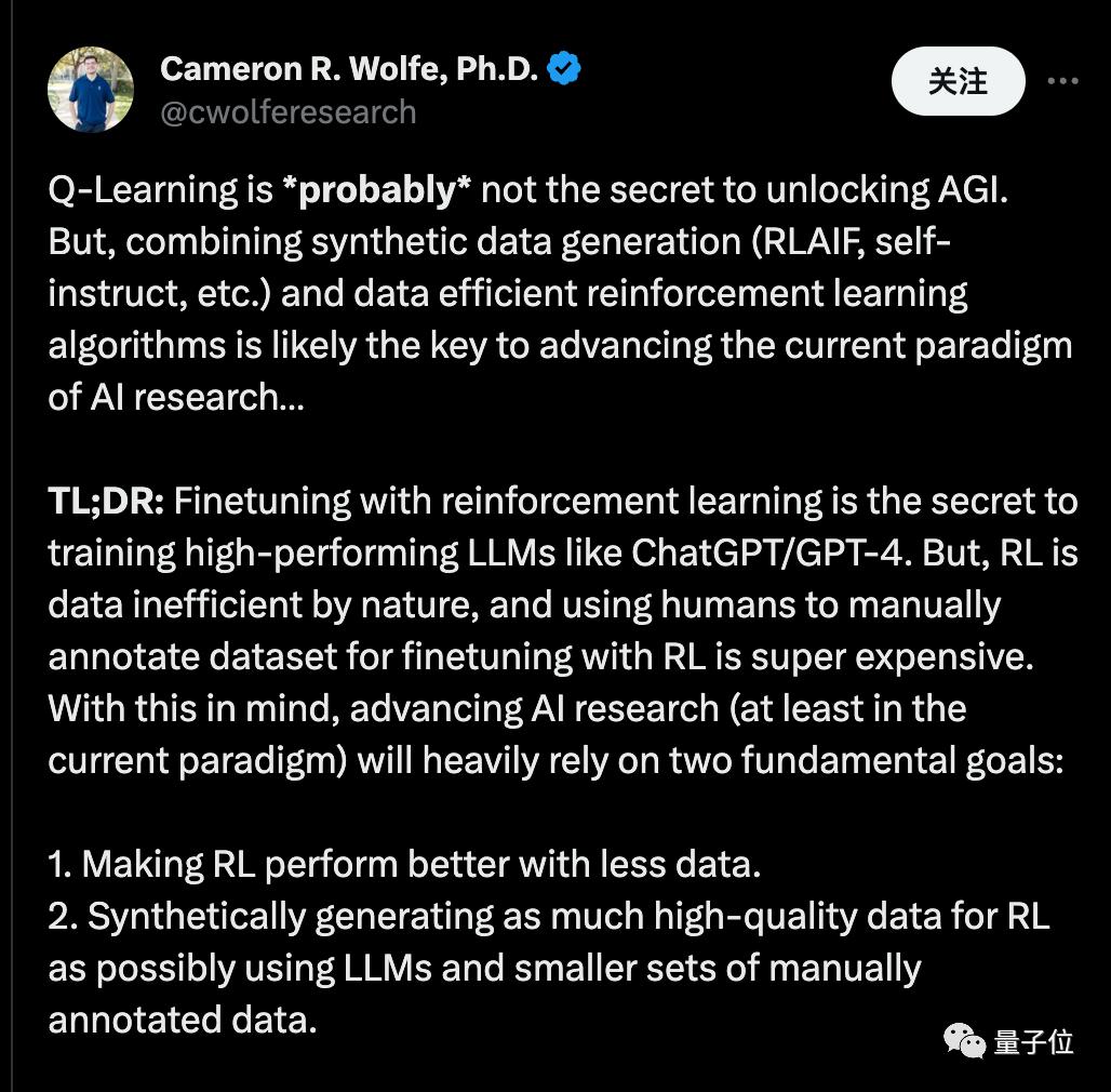 莱斯大学博士Cameron R. Wolfe表示,Q-Learning可能并不是解锁AGI的秘诀。但将“合成数据”与“数据高效的强化学习算法”相结合,可能正是推进当前人工智能研究范式的关键。