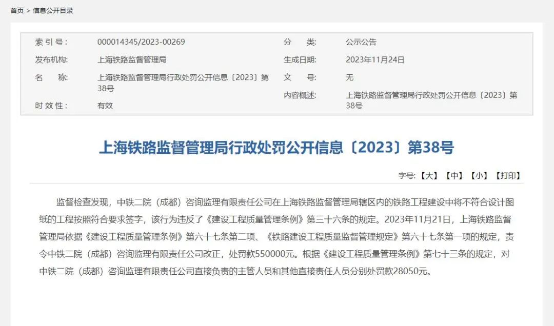 第38号监督检查发现,中铁二院(成都)咨询监理有限责任公司在上海铁路监督管理局辖区内的铁路工程建设中将不符合设计图纸的工程按照符合要求签字,该行为违反了《建设工程质量管理条例》第三十六条的规定。2023年11月21日,上海铁路监督管理局依据《建设工程质量管理条例》第六十七条第二项、《铁路建设工程质量监督管理规定》第六十七条第一项的规定,责令中铁二院(成都)咨询监理有限责任公司改正,处罚款550000元。根据《建设工程质量管理条例》第七十三条的规定,对中铁二院(成都)咨询监理有限责任公司直接负责的主管人员和其他直接责任人员分别处罚款28050元。
