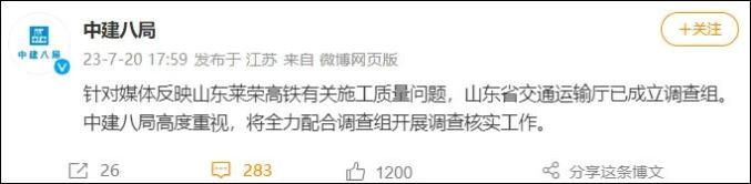 截图自国家铁路局官方微博中国建筑第八工程局有限公司官方微博 @中建八局 通报称,针对媒体反映山东莱荣高铁有关施工质量问题,山东省交通运输厅已成立调查组。中建八局高度重视,将全力配合调查组开展调查核实工作。