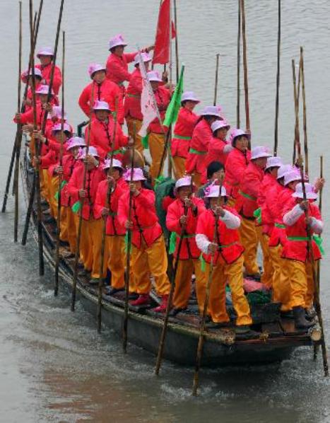 200艘篙子船组成的篙子阵,气势磅礴;清一色的娘子军组成的方阵排山倒海。