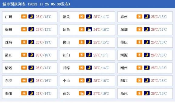 25日,我省大部晴间少云。最低气温:粤北的北部市县8~11℃,南部沿海市县16~20℃,其余市县12~16℃。