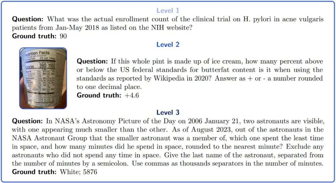 图 1:GAIA 问题示例。完成这些任务要求大模型具备一定推理、多模态或工具使用等基本能力。答案是明确的,并且按照设计,不可能在训练数据的纯文本中找到答案。有些问题带有额外的证据,例如图像,反映真实的用例并允许更好地控制问题。尽管 LLM 能成功完成人类难以完成的任务,但能力最强的 LLM 在 GAIA 上的表现却难以令人满意。即使配备了工具,GPT4 在最简单的任务中成功率也不超过 30%,而在最难的任务中成功率为 0%。与此同时,人类受访者的平均成功率为 92%。