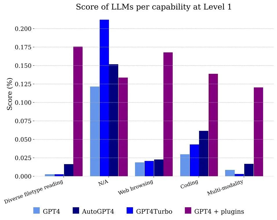 图 5 显示了按功能划分的模型获得的分数。显然,单纯的 GPT-4 无法处理文件和多模态,但能够解决注释者使用网页浏览的问题,主要是因为它正确地记忆了需要组合的信息片段以获得答案。
