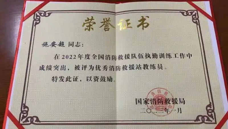 2023年2月,在新海消防救援站的年终表彰大会上,有一本荣誉证书尤其特别。国家消防救援局“优秀消防救援站教练员”,这是施安超获得的又一项荣誉。站在队伍面前的他正如一面旗帜,既是新海消防救援站的标杆,又是全体指战员的“风向标”。