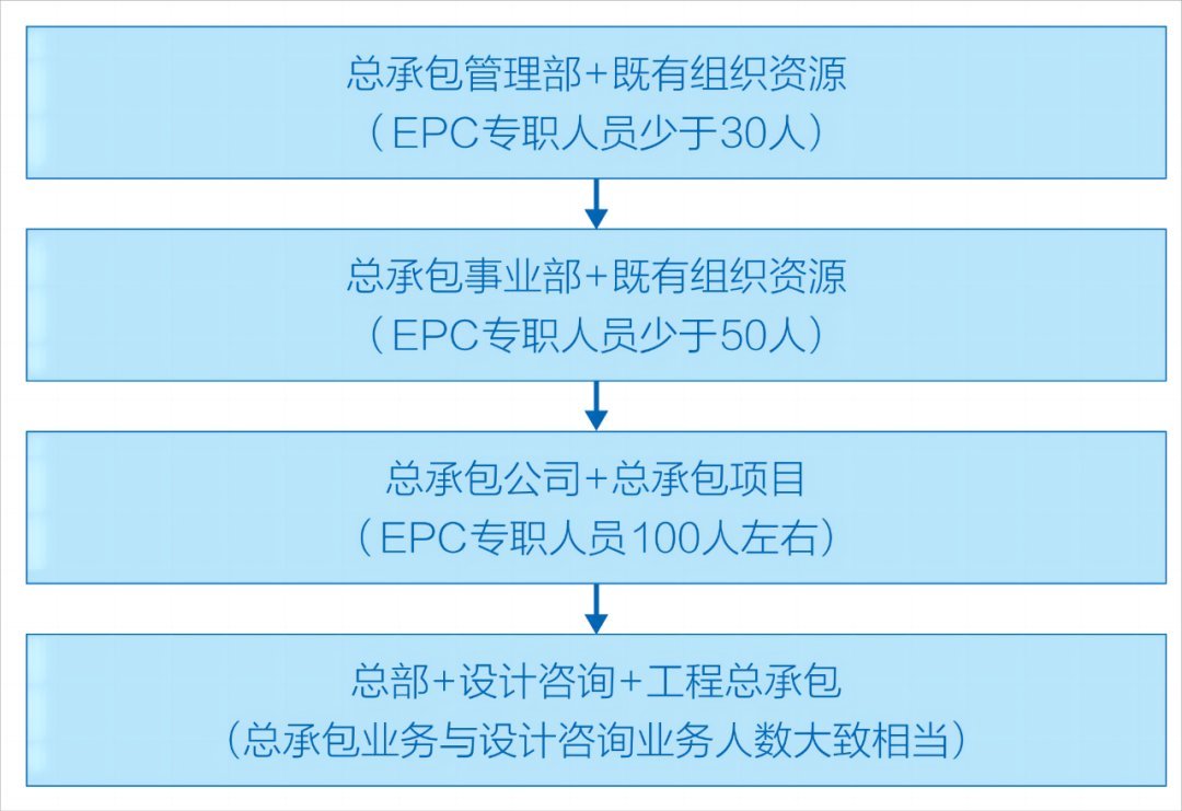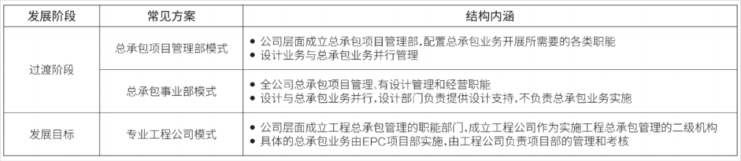 表1–表3分别介绍了工程设计企业向工程总承包升级的组织架构升级路径和进化过程。在实际实施中,工程设计企业要针对的不同发展阶段、结合自身的资源禀赋,研究制订既能激发现有组织资源,又能促进工程总承包业务长远发展的科学的组织架构。