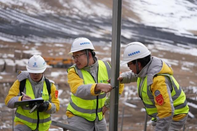 风雪强斗志更强,海拔高追求更高。面对一系列棘手的难题,突击队、先锋队员们扎根现场,先后攻克了“高原冻土、碎石、湿地等复杂地质条件成桩难”“高海拔极寒地区冬季混凝土连续施工质量控制难”“大风低温条件下支架及组件大规模安装难”等10余项技术难题。通过创新“引孔+回填”工艺,提升静压桩成桩质量与施工效率,使用多层保温措施突破高寒高海拔地区冬歇期混凝土浇筑限制。在地质条件复杂的川西高海拔地区积累了大规模地面光伏的开发经验,创造了大型光伏项目在高寒高海拔地区冬季连续大规模施工的先例。