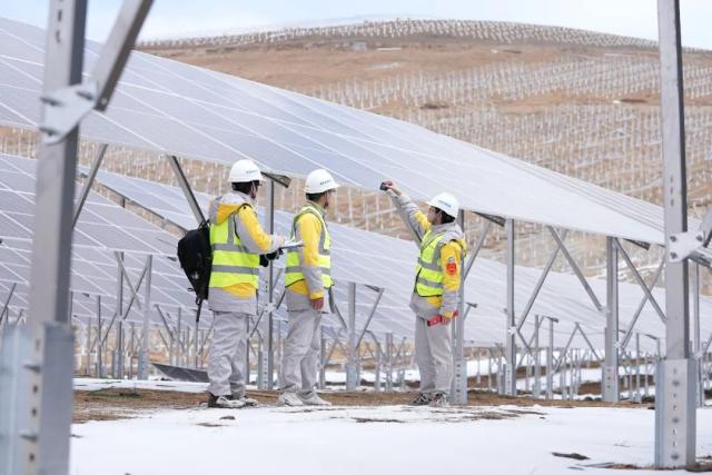 ↑柯拉建设者检查光伏组件安装情况敢耐冰寒能守寂,愈临风热更生香,柯拉建设者像格桑花一样顽强地扎根在高原之上。傍晚,绵延成势的光伏板被镀上了一层耀眼的金边,夕阳的余晖洒在建设者的脸上,“最开始这里还只有一望无际的草原和山头,如今蓝色光伏板与绿色高原草甸相互辉映,成群的牦牛在光伏板下悠闲地吃草,我感到很自豪。”青年党员李乐乐开心地说道。