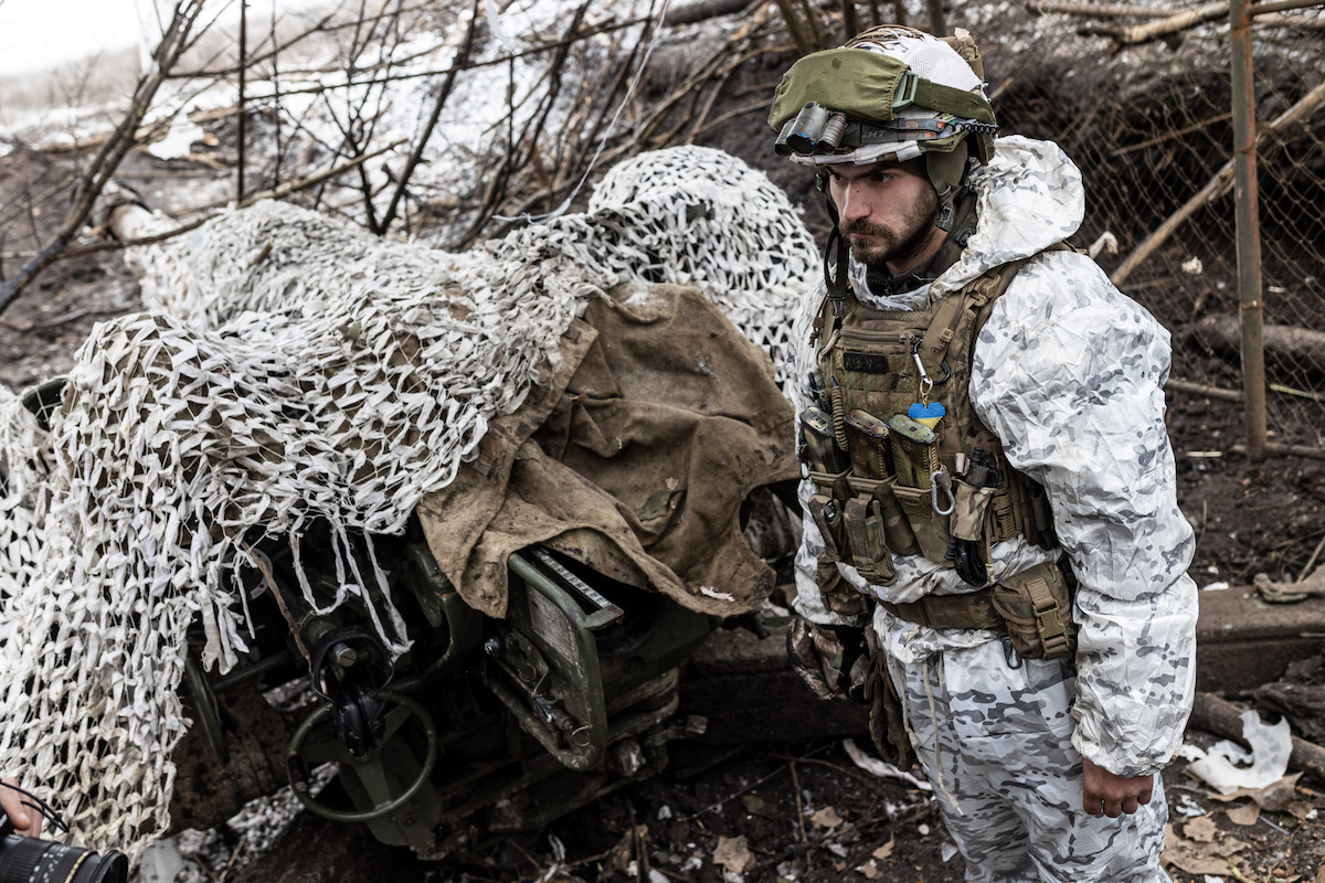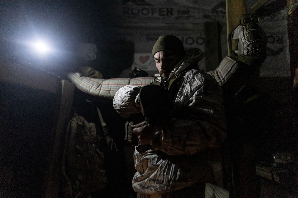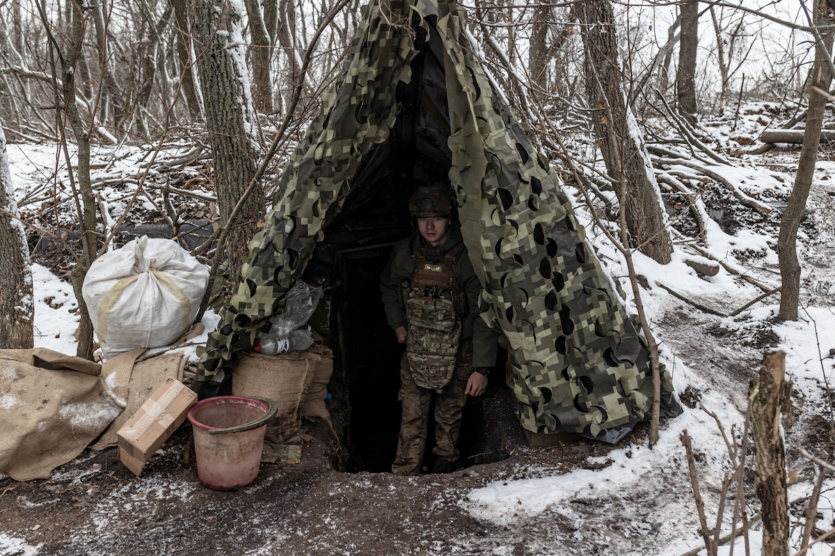 当地时间2023年11月23日,顿涅茨克州,身穿冬季迷彩服的乌克兰士兵呆在阵地掩体中。