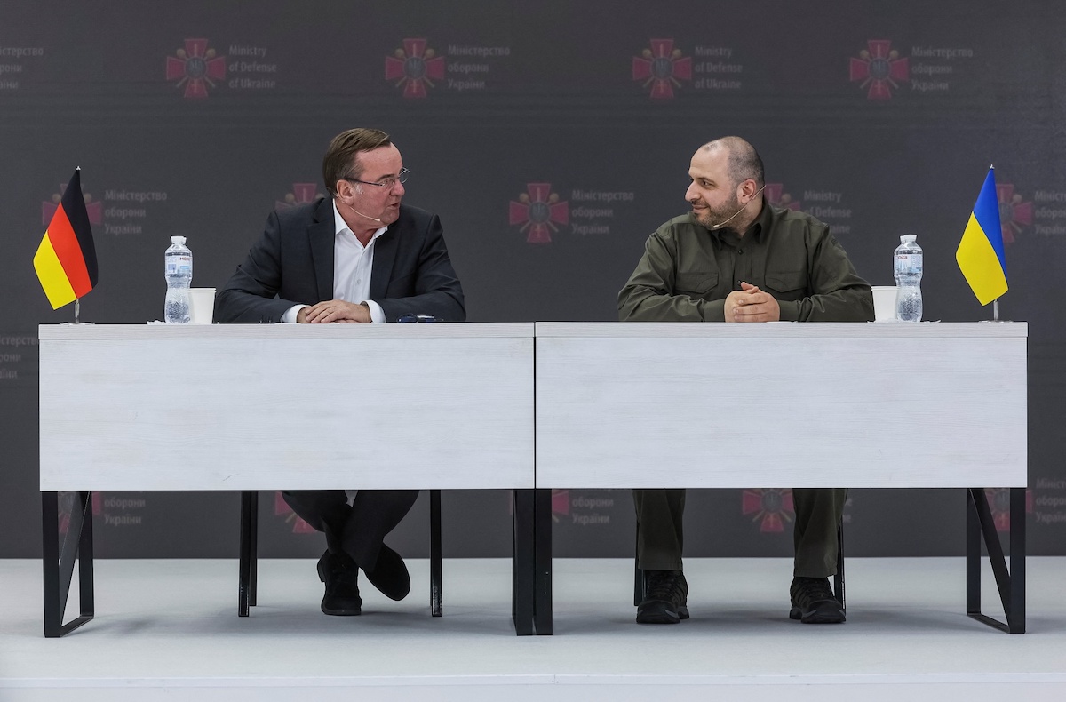 当地时间2023年11月21日,乌克兰基辅,乌克兰国防部长乌梅罗夫与德国国防部长皮斯托留斯出席新闻发布会。德国防长宣布向乌克兰提供新一轮13亿欧元的军事援助。
