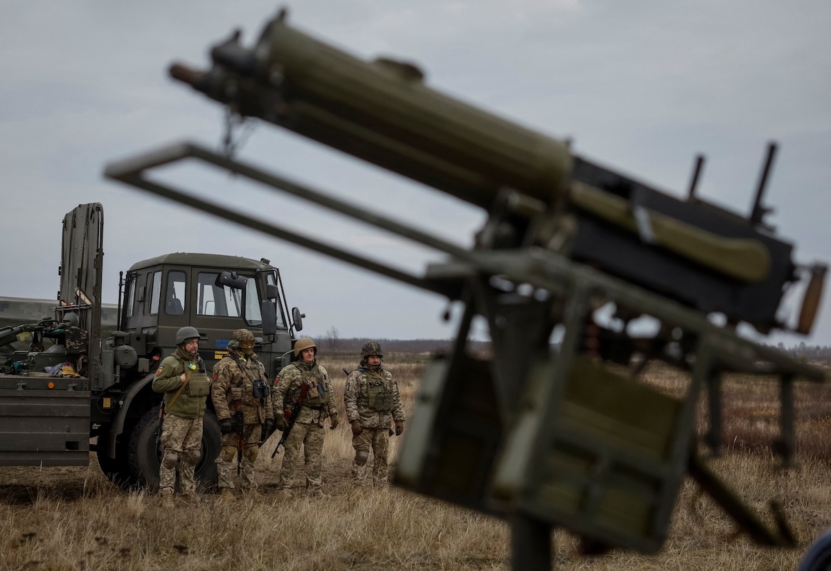 当地时间2023年11月11日,乌克兰切尔尼戈夫地区,乌克兰士兵参加防空演习。