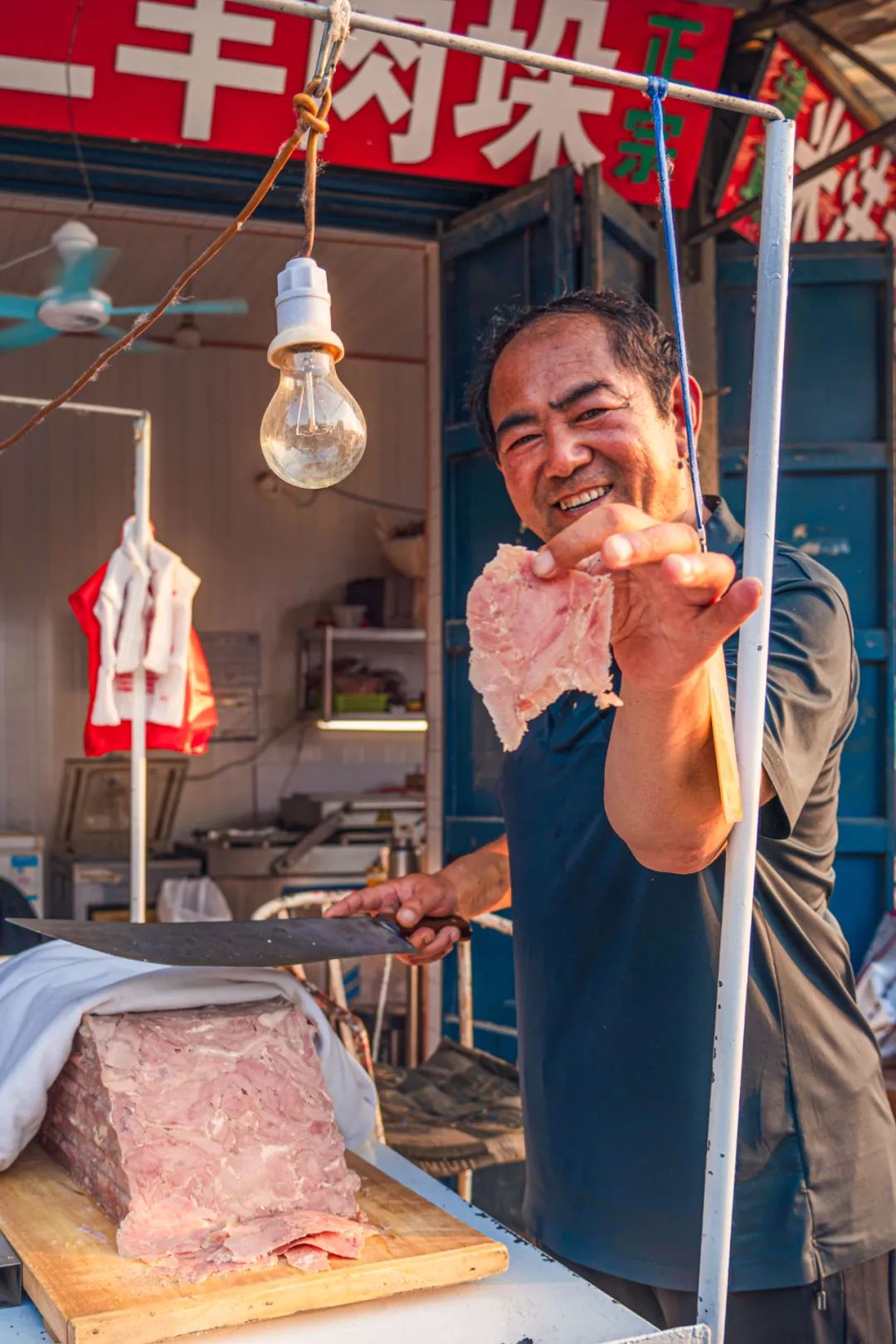曹县人对做牛肉也别有一番心得,别处常见的酱牛肉,在这里却被称为烧牛肉。顾名思义,牛肉光是卤好还不算完,还得在香油中“烧”一遍。直至牛肉的每一根纤维都吸饱了香油的醇香馥郁,就连颜色都变成了诱人的枣红色才大功告成。