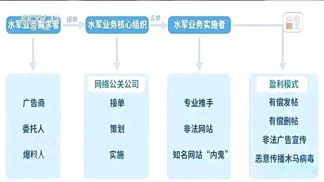 梳理相关案件可以发现,“网络水军”的运作已形成模式化流程和产业链。广告商、委托人、爆料人等“水军业务需求者”在平台下单后,由所谓的网络公关公司接单并派发给专业“刷手”等“水军业务实施者”。这些“水军”按任务要求操作,牟取非法利益后,相关人员再按比例进行分成。
