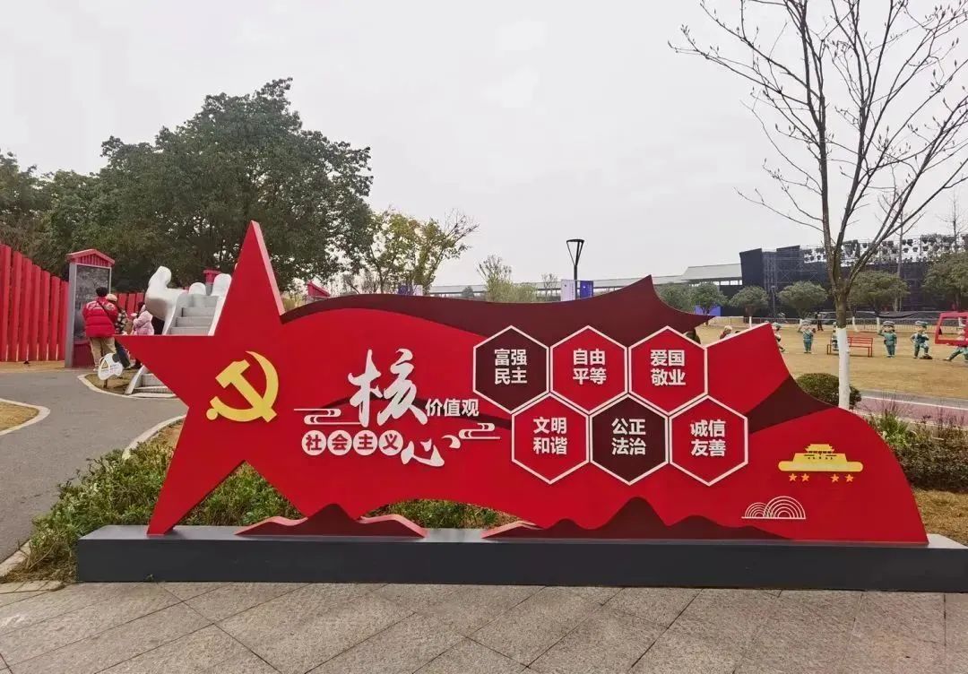 除此外,漫步在公园绿道内,随处可见社会主义核心价值观、文明市民公约等景观小品。