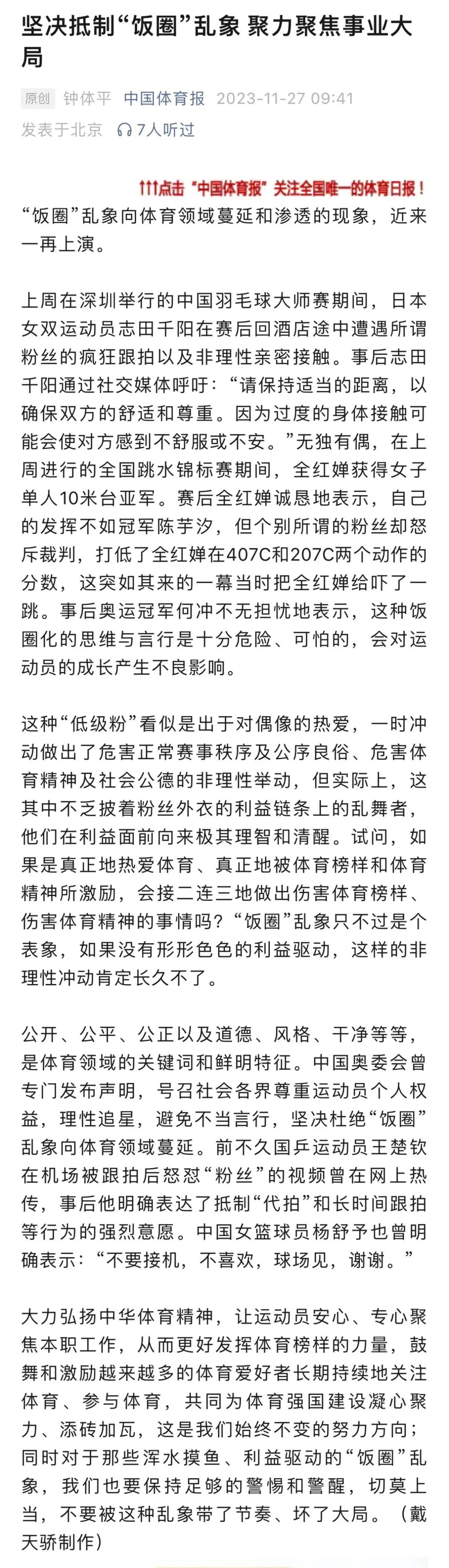 “在体育与娱乐日益混合的当今社会中,我们必须警惕不让娱乐圈的风气影响到体育的纯粹性。希望粉丝能理智追星。”何冲在文中写道,“运动员在追逐梦想的同时,需要不断自我提升,努力克服所有挑战。粉丝也应该给予他们正确的引导和支持,以便他们能够在健康的环境中成长,最终为国家赢得荣誉。”
