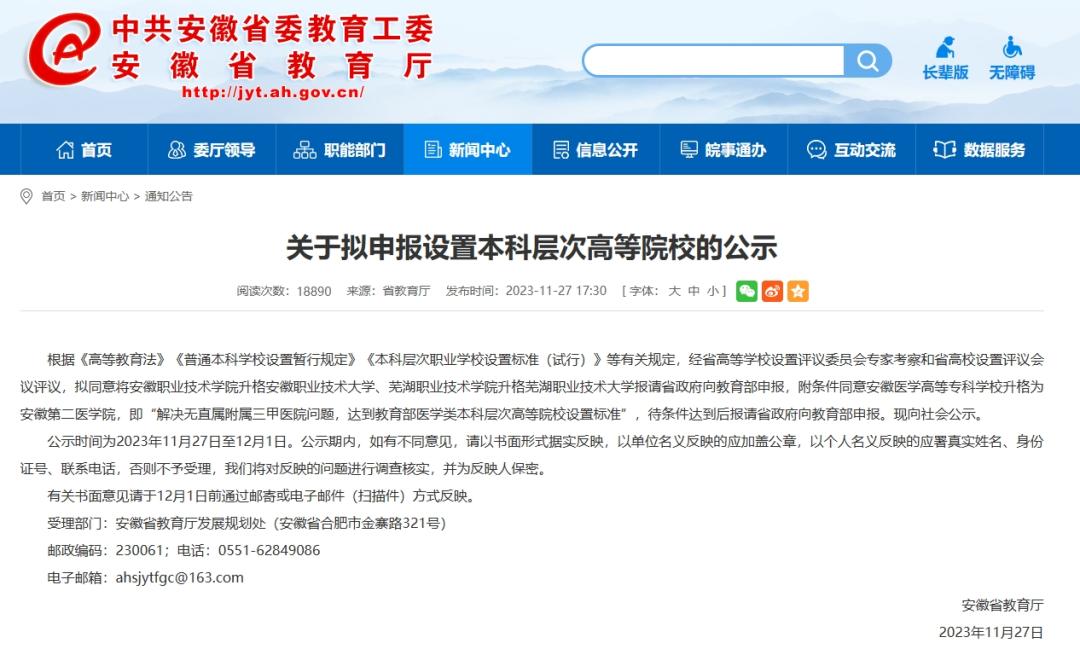 11月27日,安徽省教育厅发布《关于拟申报设置本科层次高等院校的公示》,根据《高等教育法》《普通本科学校设置暂行规定》《本科层次职业学校设置标准(试行)》等有关规定,经省高等学校设置评议委员会专家考察和省高校设置评议会议评议,拟同意将安徽职业技术学院升格安徽职业技术大学、芜湖职业技术学院升格芜湖职业技术大学报请省政府向教育部申报,附条件同意安徽医学高等专科学校升格为安徽第二医学院,即“解决无直属附属三甲医院问题,达到教育部医学类本科层次高等院校设置标准”,待条件达到后报请省政府向教育部申报。现向社会公示。