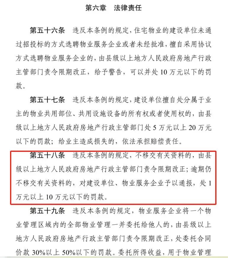 根据我国《物业管理条例》第五十八条的规定:“违反本条例的规定,不移交有关资料的,由县级以上地方人民政府房地产行政主管部门责令限期改正;逾期仍不移交有关资料的,对建设单位、物业服务企业予以通报,处1万元以上10万元以下的罚款。”