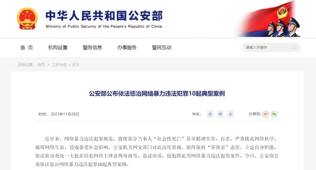 11月25日,网传一名老人在参观西安兵马俑时,往兵马俑坑中吐痰、扔未熄灭的烟头,此事引发全网关注……【点击查看详情】13 公安部公布依法惩治网络暴力违法犯罪10起典型案例