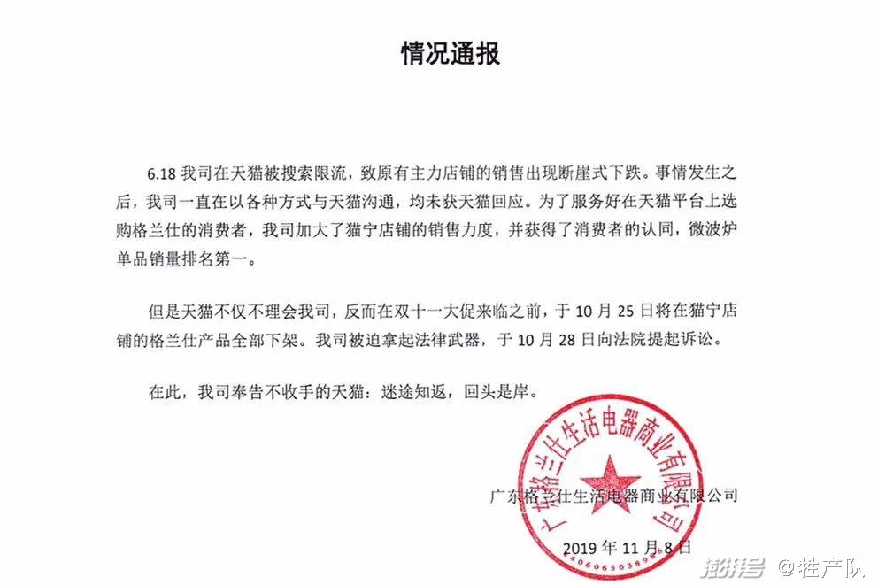 在这个过程中,格兰仕就曾因脚踏两只船,同时参加拼多多的百亿补贴和淘宝的双十一,被淘宝天猫屏蔽,损失惨重。后来,在双十一中,格兰仕又遭到天猫店全线产品被下架。
