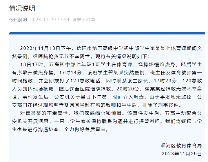 情况说明称,2023年11月13日下午,信阳市第五高级中学初中部学生翟某某上体育课期间突然晕倒,经医院抢救无效不幸离世。现将有关情况说明如下: