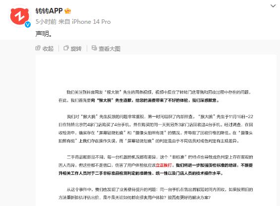 11月29日,转转通过官方微博@转转APP 向猴大腕道歉并表示,在回收检测中,手机确实存在“屏幕轻微划痕”和“摄像头拍照有斑”的情况,这导致回收价格有所降低。