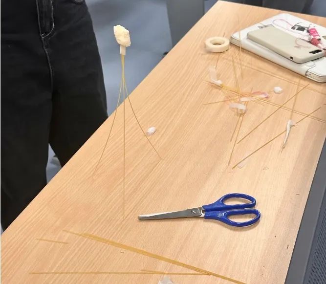 一番思考后,各小组同学纷纷展开讨论。“三角形具有稳定性,塔的底部可以利用三角形来稳固!”“先用意面搭一个双层高塔,再把棉花糖固定在顶端……”同学们的计划听起来都很严密,可在“建造”的过程中,却是状况百出,意大利面碎了!棉花糖倒了!……在第一次倒计时结束时,没有一个小组完成任务。