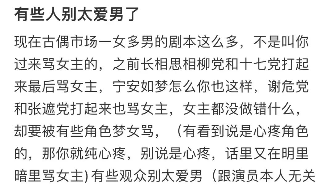 观众也开始类比同类型的角色,比如喜欢宁遮和喜欢夭柳的是不是同一批人,喜欢燕临和涂山璟的一定很爱守护忠犬的设定。爱疯批的,《长相思》站夭玹,《宁安如梦》坚定站宁危。