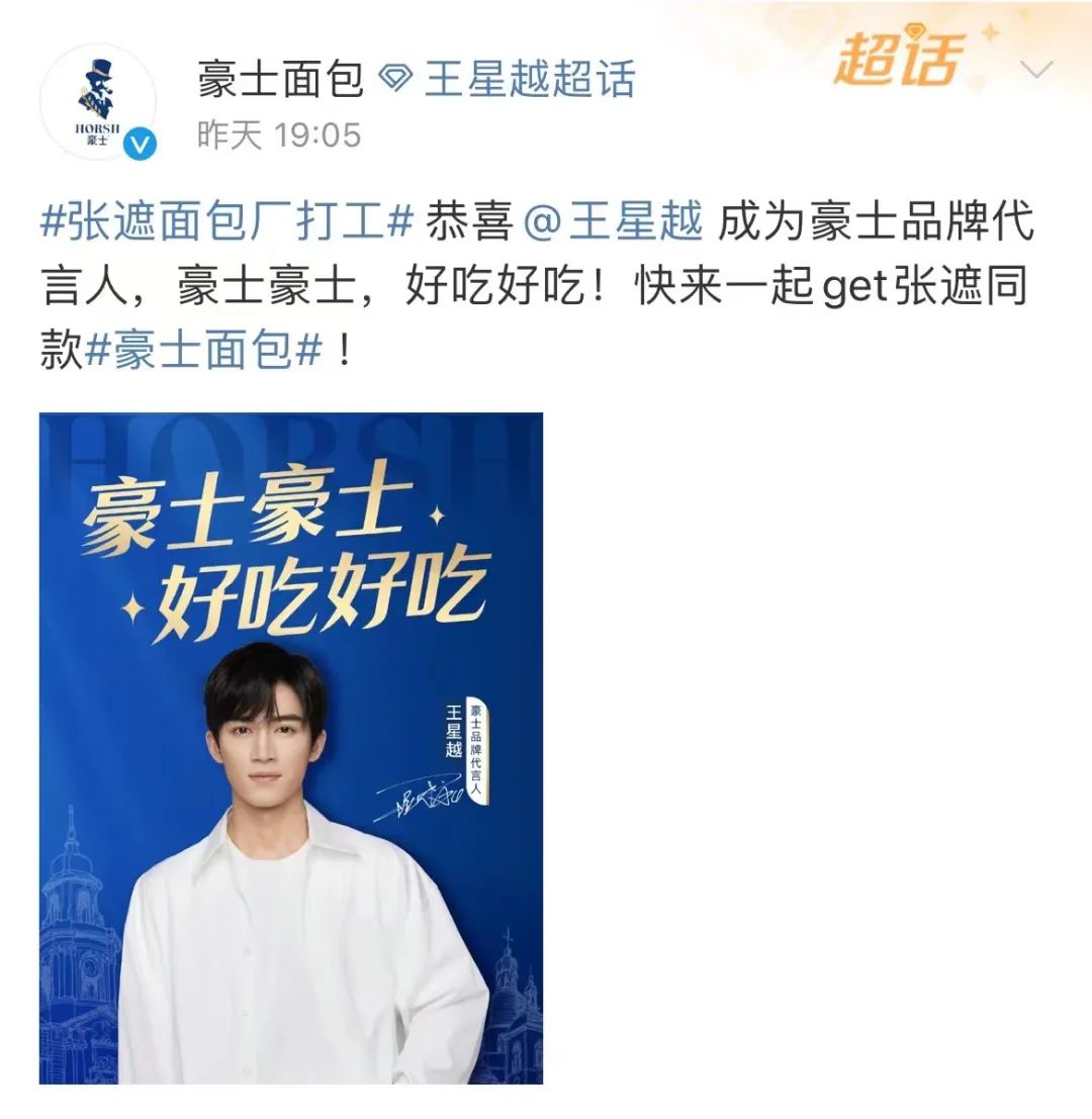 前期以中插广告的形式出现为剧集造梗,剧集和梗的热播出圈,王星越从豪士面包大使,签约为正式的代言人。有效提升商务价值,期间官宣纯甄品牌挚友、还为CT彩妆线下站台、做客荣耀手机直抖音播间、mcm推广。时尚方面,解锁了首个个人杂志封面。