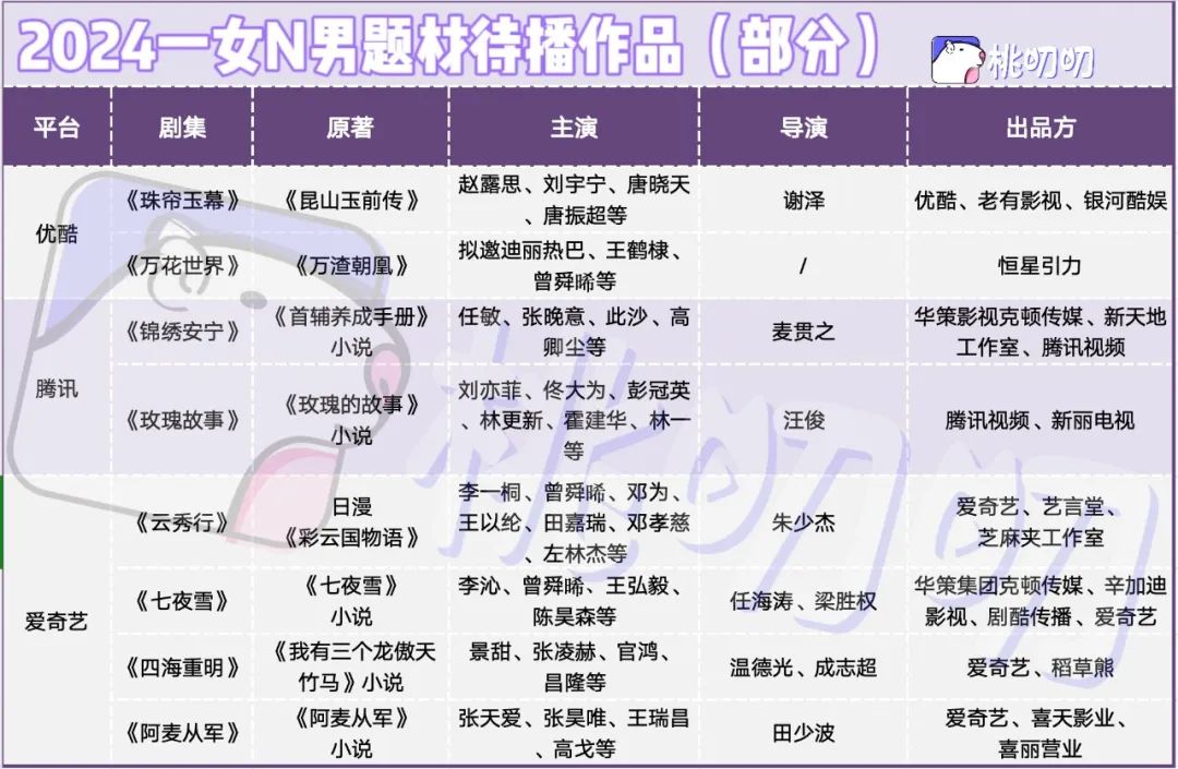 2024谁能出爆款?1vN对于剧集制作方来说,女主有知名度能抗剧,男性配角大多会选择找性价比高的男艺人。节约成本,又能捧出新人,甚至流量,也是稳赚不赔的。