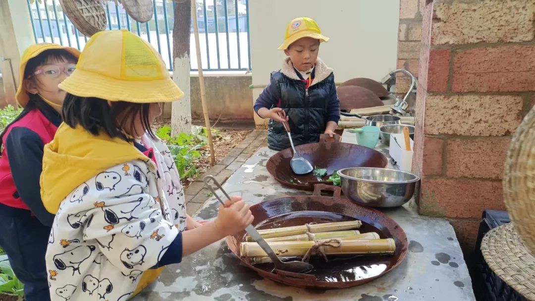 老师带领小朋友用竹子汁或竹子碳制作颜料,以竹子为主题进行绘画创作;编织花篮、蒸架、刷子等简单的手工艺品;用竹叶包裹饭菜,自己动手制作竹叶饭。