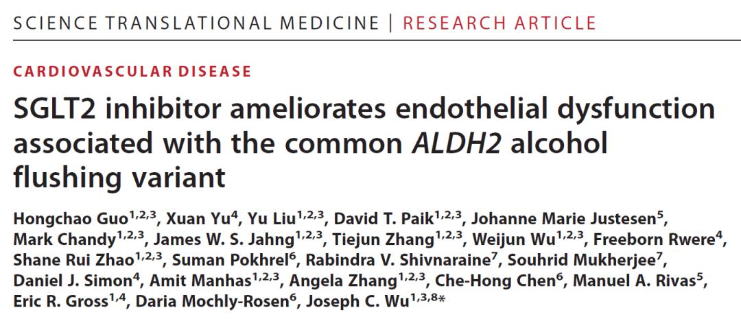 2023年1月,斯坦福大学吴庆明(Joseph C. Wu)团队在 Science 子刊 Science Translational Medicine 上发表了题为:SGLT2 inhibitor ameliorates endothelial dysfunction associated with the common ALDH2 alcohol flushing variant 的研究论文【1】。