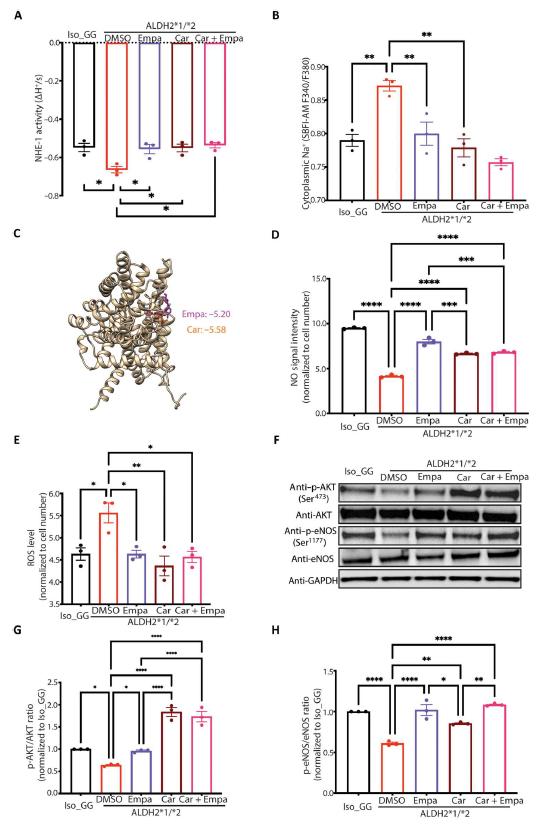 结果显示,SLGT2抑制剂(SGLT2i),例如Empagliflozin(恩格列净,一种2型糖尿病药物)可以缓解ALDH2*2相关内皮细胞功能障碍。SGLT-2,即钠-葡萄糖协同转运蛋白2,负责肾脏对葡萄糖的重吸收。研究团队在ALDH2*2基因敲入小鼠模型上进行了进一步验证,结果显示,Empagliflozin可在体内缓解ALDH2*2介导的血管功能障碍。从机制上来说,Empagliflozin抑制了Na+/H+交换器1(NHE-1),激活AKT激酶和内皮细胞一氧化氮(NO)合成酶(eNOS)通路,从而改善ALDH2*2诱导的血管内皮细胞功能障碍。