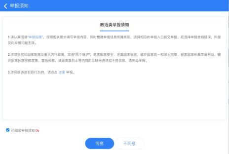 第四步:认真阅读各类型内容的“举报须知”,勾选“已阅读举报须知”并点击“同意”按钮。