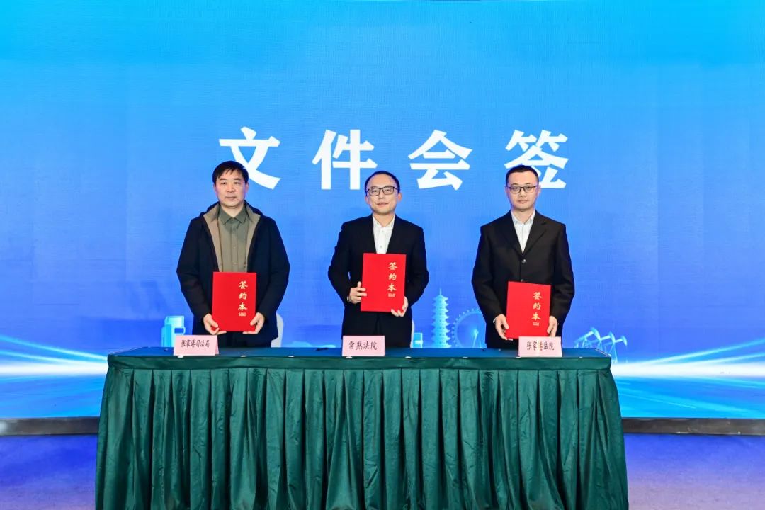 常熟市人民法院党组成员、副院长马建锋,张家港市人民法院党组成员、副院长吴丹,张家港市司法局党委委员、副局长周炳芳签订《关于设立行政争议协同化解工作站的意见》。