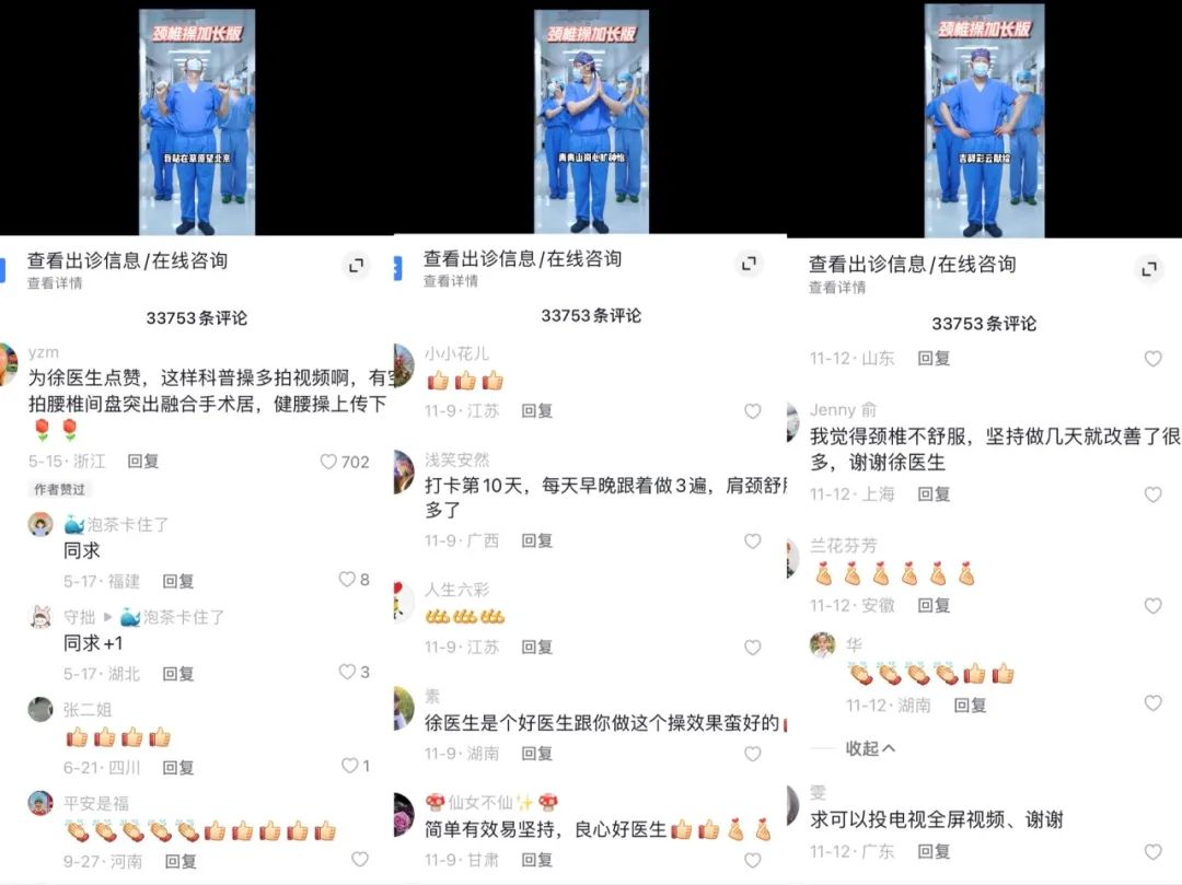 徐文斌的做操教学视频下面,有着几万条留言。像之前的颈椎操,3个简单动作帮“低头族”放松脖子,光是在一个视频平台上,收藏量、点赞量就双双超过140万。徐文斌自己也没想到视频会有这么大传播量:“那天刚下手术台一看手机都‘爆’了。”