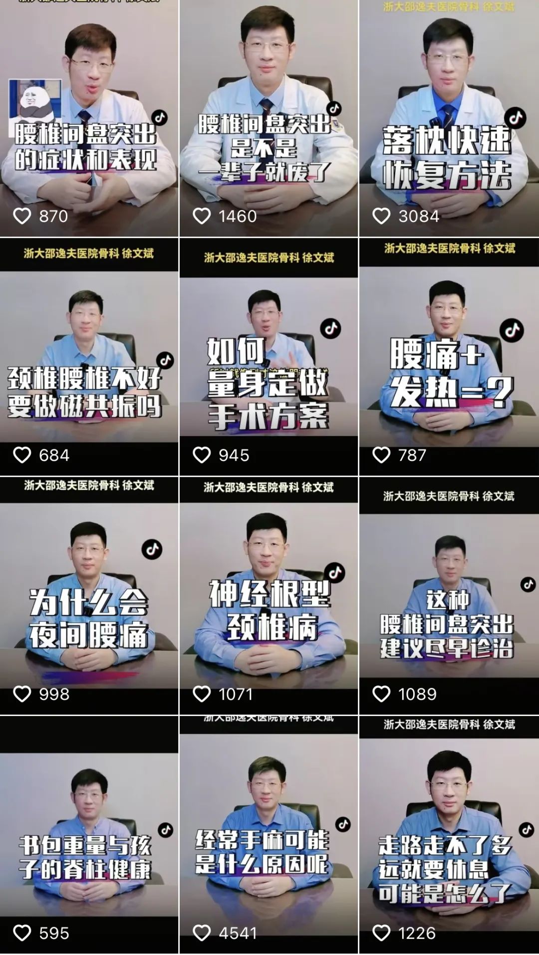 视频讲什么?就讲每天门诊遇到的案例。“常有病人让我印象深刻,”徐文斌说有位60多岁的女患者,退休了本来准备去四处走走,没想到一年内骨折了4次,全国游变成了“医院游”,受尽病痛折磨,“作为医生,我很能明白她心中的苦。多次骨折背后的原因是骨质疏松,这是很多中老年人都会面临的问题。我就查了资料,结合病例,做了一期关于预防骨质疏松的科普视频。”