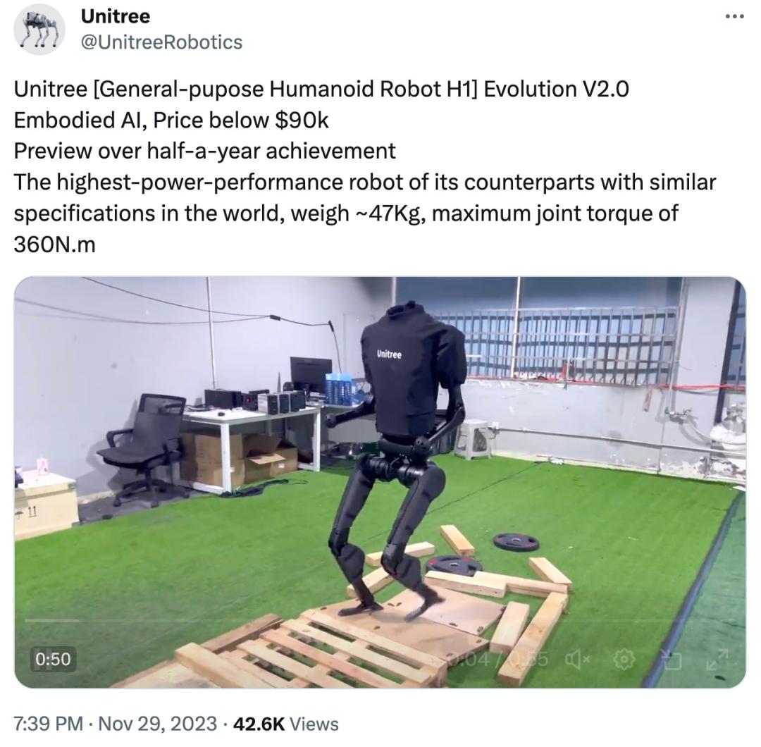 参考链接:https://twitter.com/UnitreeRobotics/status/1729827310423953698