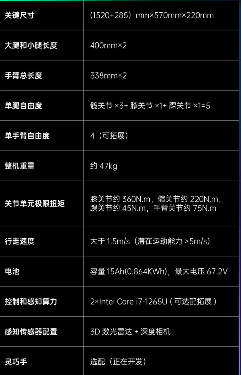 由于搭载了宇树内部开发的 M107 关节电机,机器人的动力性能强,运动灵活性、速度、续航包括负载能力都有显著提升。单腿关节为 5 自由度,单手臂为 4 自由度。步行速度 1.5 米 / 秒,与成人步速相当。与当年 Asimo 踩高跷似的行走姿态不同,H1 步伐流畅、稳健,还能小步快跑。