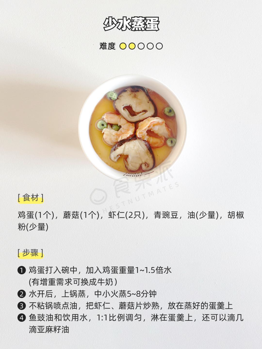 胃口小的人,水蒸蛋推荐“少水”模式。水多了占肚子,影响其他食物的摄入。可以用蛋壳装水,装2-3蛋壳就可以了。