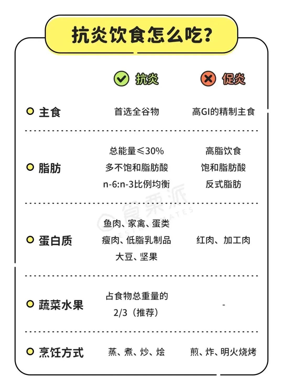 所以,实践抗炎饮食的时候,除了选那些具有抗炎潜力的食物之外,也别忘了“适量”的原则:能量要适宜,健康的碳水食物、健康的油脂、健康的蛋白质食物,还有各种富含抗炎成分的水果,也都要讲究一个适量。
