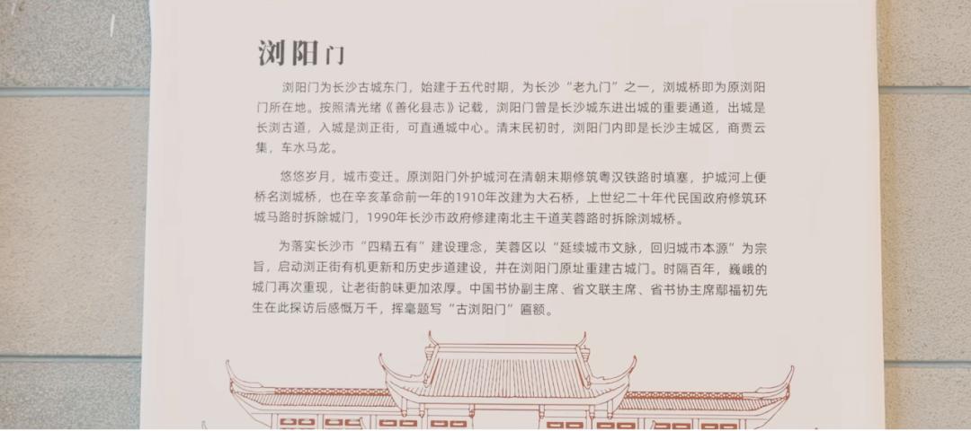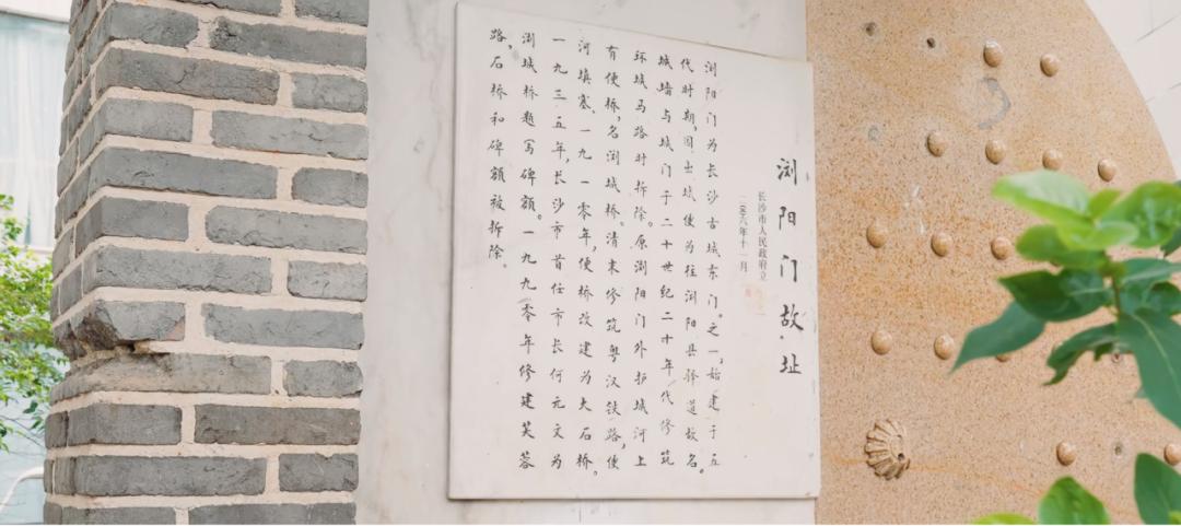 浏阳门旁有一块故址碑,在这块故址碑上,详细地介绍了浏阳门的历史来源。浏阳门曾是长沙城东进出城的重要通道,出城是长浏古道,入城就是浏正街,可直通城中心。20世纪20年代初,浏阳门及其城墙因修筑环城马路被拆除。如今,时隔百年,巍峨的城门再次重现,让老街韵味更加浓厚。