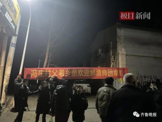 晚上6时30分许,在威县老家的冯庄,已经有不少乡亲们早早等在门口,拉起了横幅“欢迎解清帅回家”,等待一家人的到来。