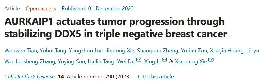 12月1日,中山大学研究人员联合湖南省常德市第一人民医院研究人员共同在期刊《Cell Death & Disease》上发表题为“AURKAIP1 actuates tumor progression through stabilizing DDX5 in triple negative breast cancer”的研究论文,我们的研究主要揭示了AURKAIP1/DDX5/β-catenin 轴调节 TNBC 进展的分子机制,表明AURKAIP1可能作为治疗靶点以及预后的 TNBC 特异性生物标志物。