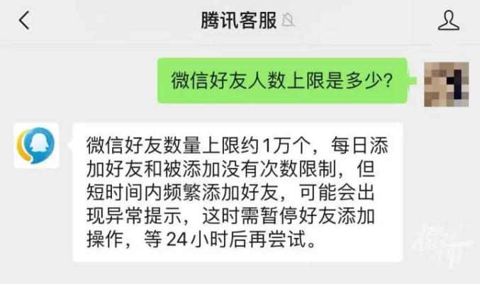 这是真的吗?记者把“好友上限人数”的问题,提交给了“腾讯客服”,“腾讯客服”回应称:微信好友数量上限约1万个,每日添加好友和被添加没有次数限制,但短时间内频繁添加好友,可能会出现异常提示,这时需暂停好友添加操作,等24小时后再尝试。