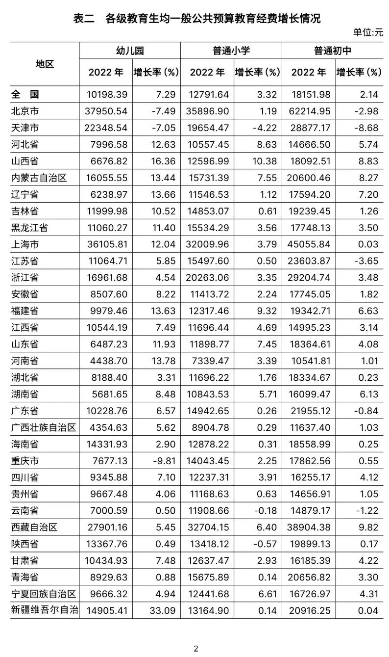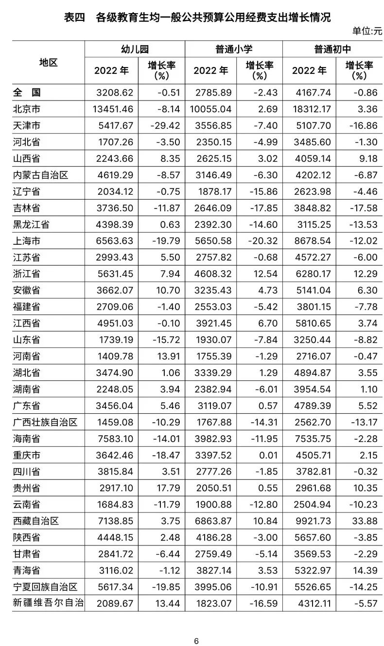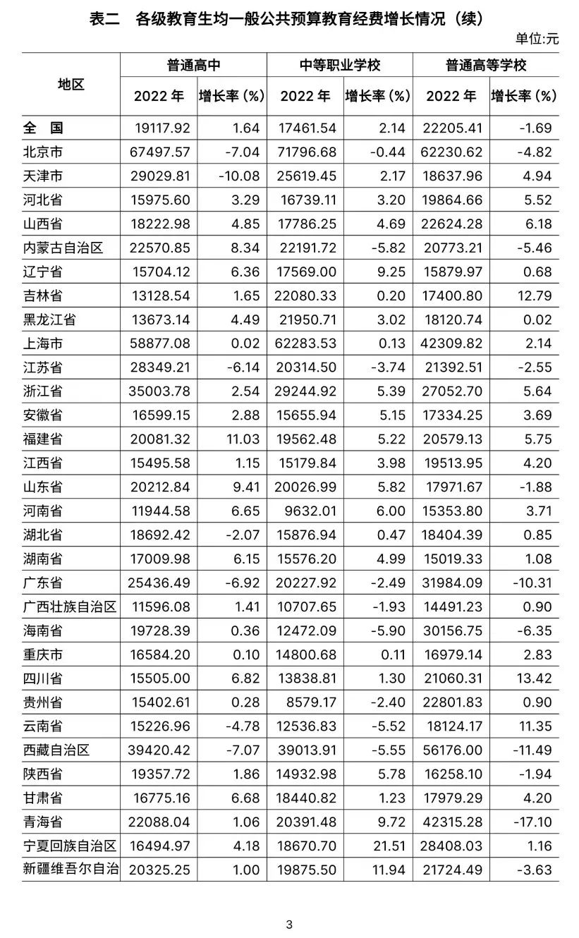3.全国普通初中为17225.61元,比上年增长2.59%。增长最快的是西藏自治区(14.10%)。