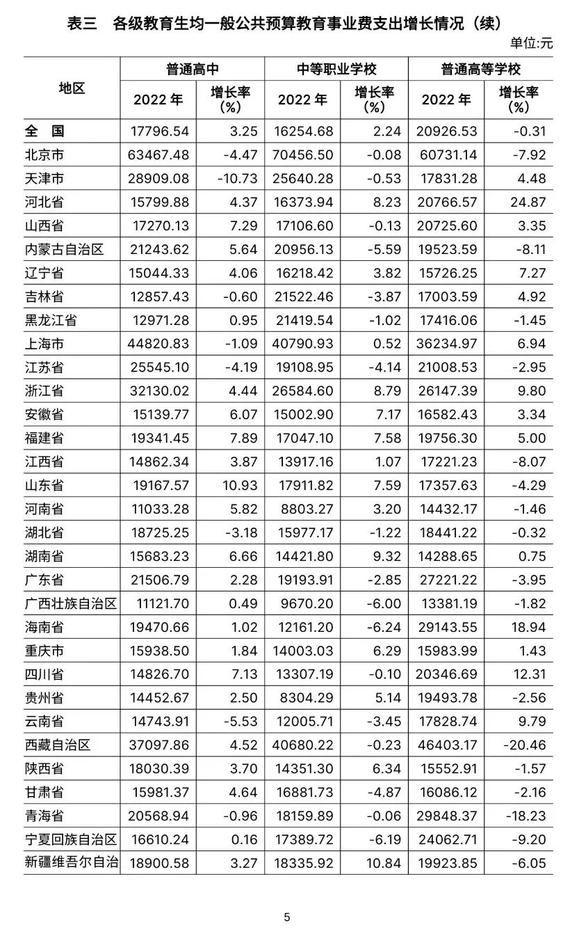 4.全国普通高中为17796.54元,比上年增长3.25%。增长最快的是山东省(10.93%)。