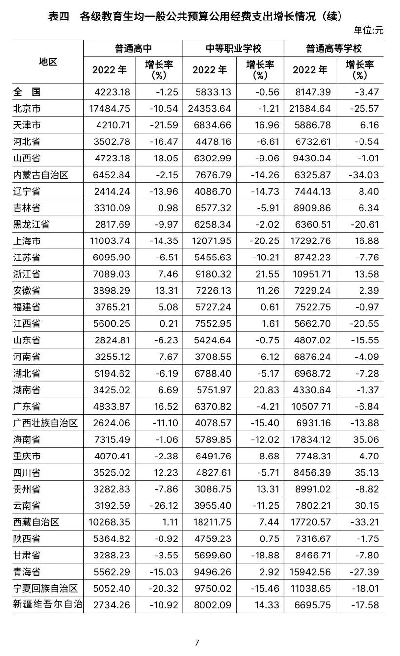 6.全国普通高等学校为8147.39元,比上年下降3.47%。增长最快的是四川省(35.13%)。