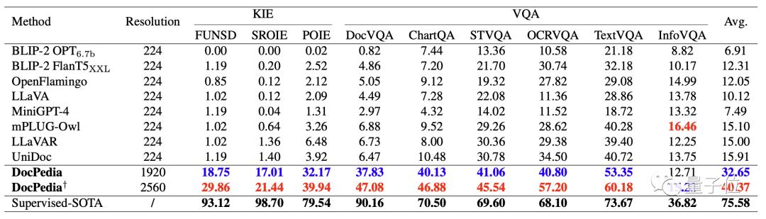 在此研究中,作者用一种新的方式解决了现有模型不能解析高分辨文档图像的短板。DocPedia分辨率可达2560×2560,而目前业内先进多模态大模型如LLaVA、MiniGPT-4等处理图像分辨率上限为336×336,无法解析高分辨率的文档图像。
