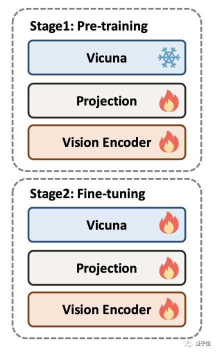 在微调阶段,大语言模型解冻,整个模型端到端优化。